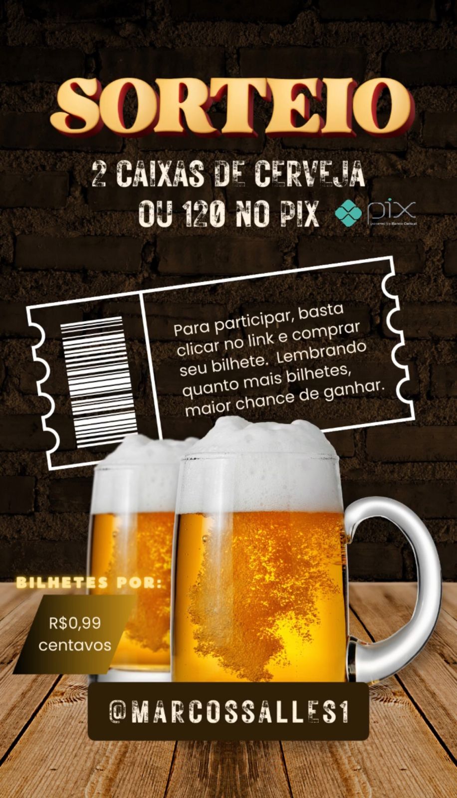 Já pensou em ganhar duas caixas de cerveja “BRAHMA OU ANTÁRCTICA” (por apenas 0,99) sexta- feira a noite? Seria um máximo não é mesmo? Sabíamos que você ia gostar dessa ideia então decidimos criar esse sorteio onde você tem a chance de ganhar essas.. 2 CAIXAS DE CERVEJA OU 120R$ NO PIX LEMBRANDO; Quanto mais você comprar maior é a chance de ganhar! BOA SORTE… O ganhador não precisa se preocupar que entraremos em contato caso ele não esteja ONLINE no Instagram ou WhatsApp! Ligarei para informar o ganhar e farei um vídeo ao vivo sorteando, deixarei o vídeo salvo no meu Instagram como prova.
