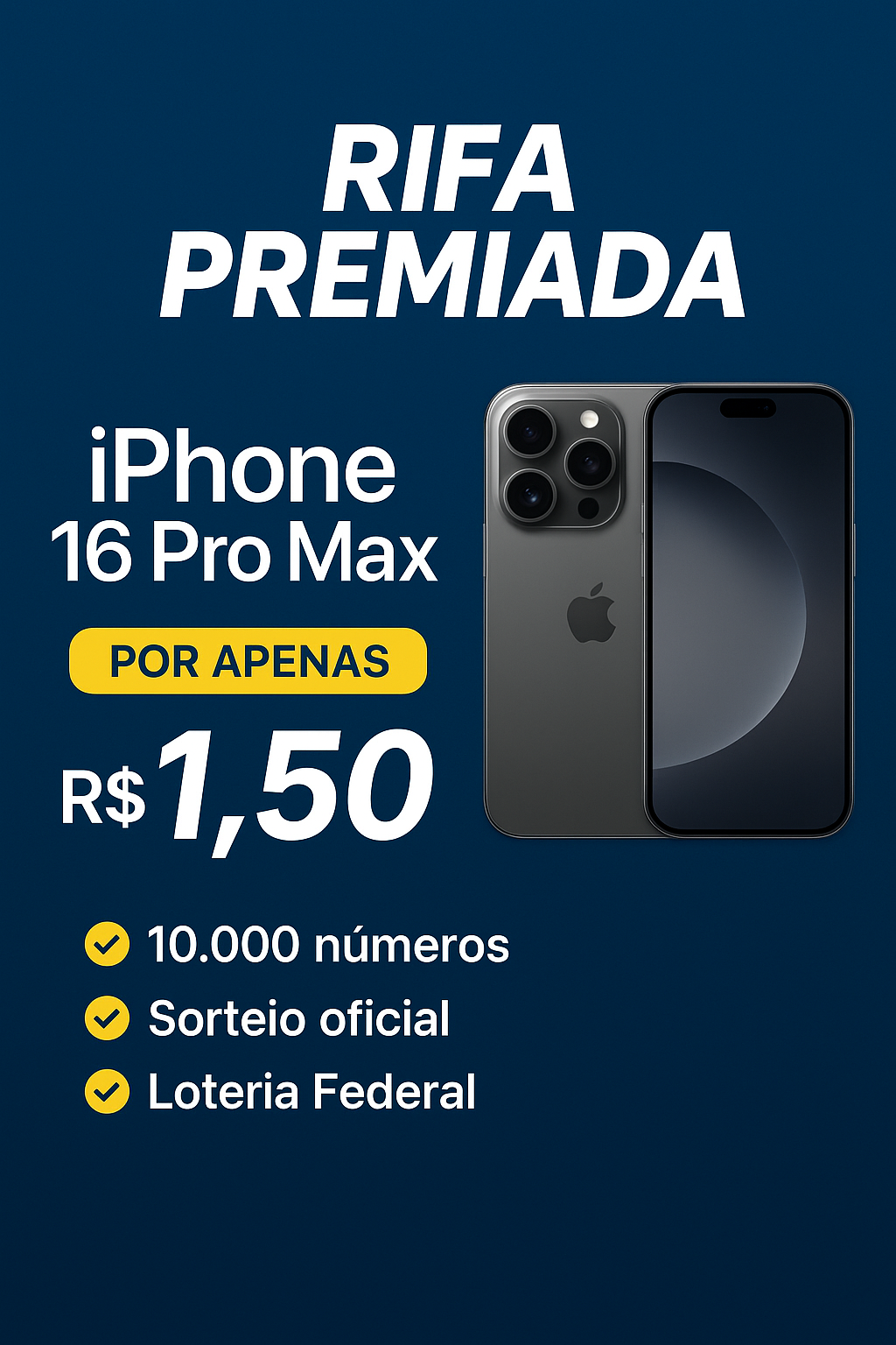 📱 SORTEIO Premiado – iPhone 16 Pro Max Você pode ter o iPhone 16 Pro Max por apenas R$ 1,50! 😱📲 Participe do nosso sorteio e concorra ao celular mais moderno e desejado do momento! 🎁 Prêmio: 01 iPhone 16 Pro Max (novo, lacrado, na caixa, cor e armazenamento conforme disponibilidade). 🎟 Valor do bilhete: R$ 1,50. 🔢 Quantidade de números: 10.000 bilhetes (de 0000 a 9999). 📅 Data do sorteio: será divulgada quando 70% das cotas forem vendidas. 📍 Sorteio oficial: pela Loteria Federal. 📜 Regulamento do Sorteio – iPhone 16 Pro Max Organização: Esta sorteio é organizada por Nathalia Vieira. Prêmio: 01 (um) iPhone 16 Pro Max, novo, lacrado e na caixa original. Valor da cota: R$ 1,50 (um real e cinquenta centavos). Quantidade de cotas: 10.000 números, de 0000 a 9999. Sorteio: Será realizado com base na extração da Loteria Federal. A data oficial será divulgada quando 70% das cotas forem vendidas. O vencedor será o participante que tiver o número correspondente aos 4 últimos dígitos do 1º prêmio da extração da Loteria Federal. Caso o número sorteado não tenha sido vendido, o prêmio passará para o número mais próximo superior já vendido. Entrega do prêmio: O ganhador deverá apresentar documento de identificação. A entrega será feita presencialmente ou enviada pelos Correios (com frete pago pela organização). Participação: Proibida a participação de menores de 18 anos. Aceitação: Ao adquirir uma cota, o participante concorda integralmente com este regulamento.